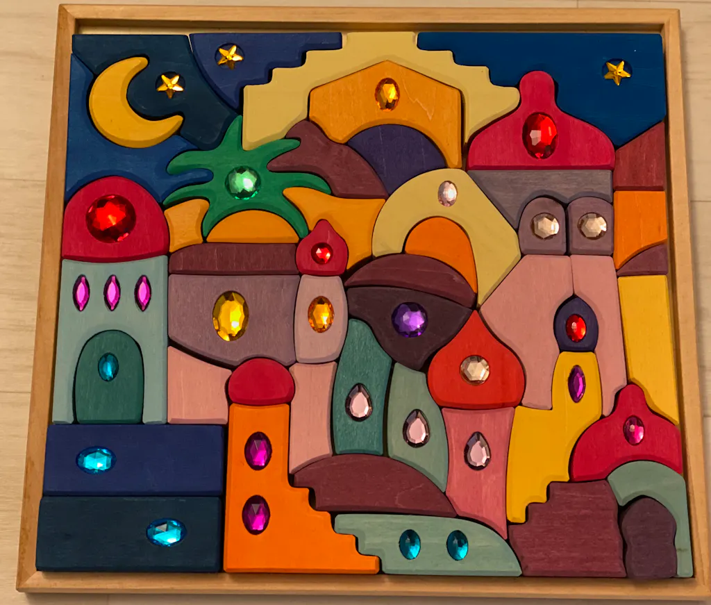 With the orient inspired and organic shapes of this set, sparkling scenes, cities and landscapes can be built. The unique variety of shapes inspires children to build new play scenes every time. This building set is a perfect complement to our Landscape Puzzle and Small Four Elements Building Set. These smaller building sets are well suited for table top play, where wonderful structures can arise or different marble games can be imagined.