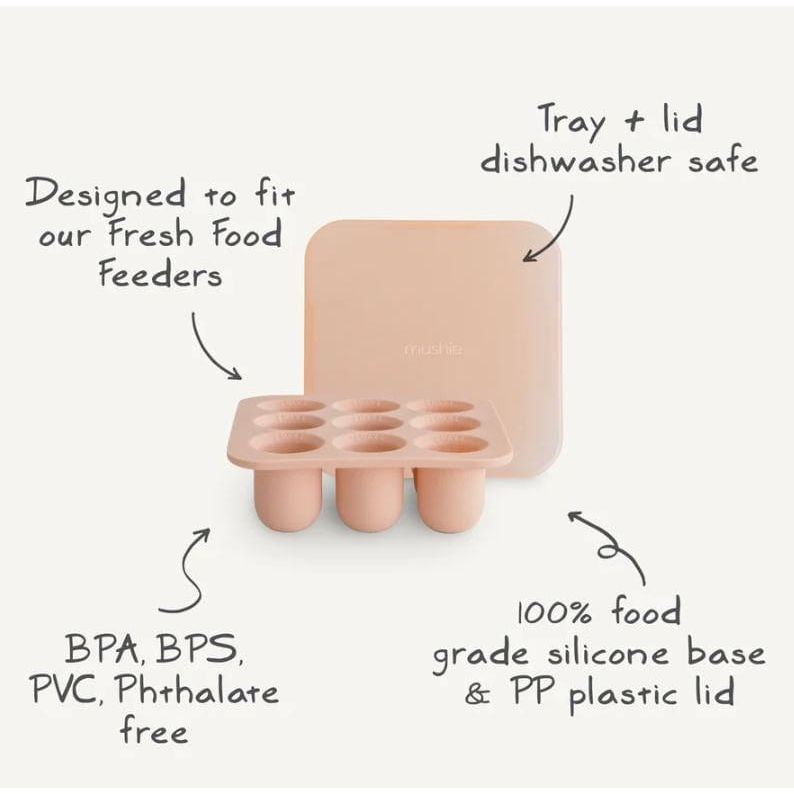 This compact silicone freezer tray is designed for freezing purees and mashed foods that fit perfectly inside the Mushie Fresh Food Feeders. Featuring nine half ounce compartments with a frosted plastic lid for easy stacking and a quick view to see how many portions remain. The tray is made out of soft, non-toxic silicone, making it easy to pop out your little’s treats once frozen. Both the lid and tray are dishwasher safe for hassle-free cleaning.