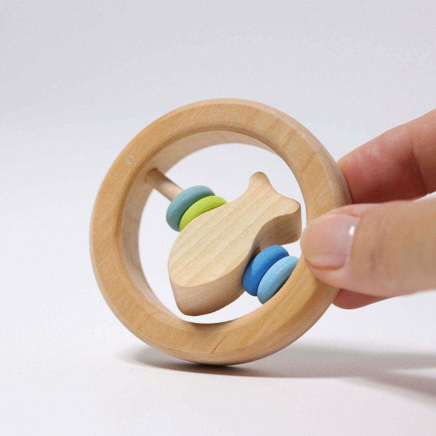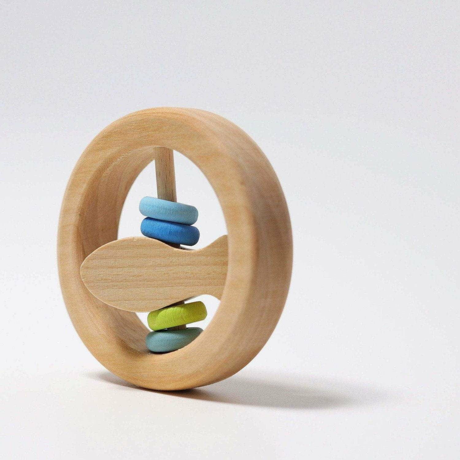 Rattle Little Fish, with wooden colored discs in green and blue.