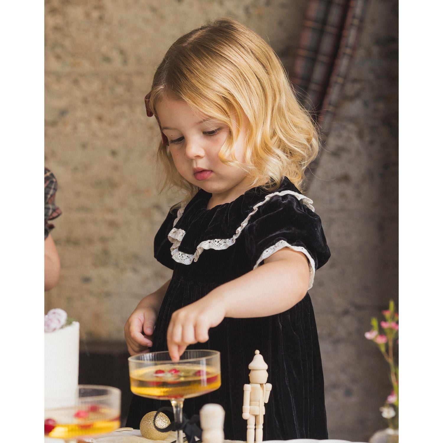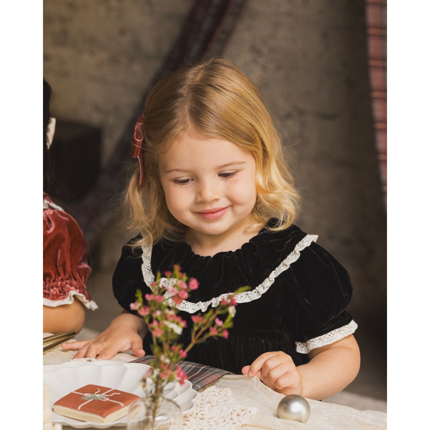 Our Amelia Dress has a sweet collar framed by beautiful bubbled sleeves and delicate lace trim. Finished with a button-back closure for easy changing. Coordinating bloomers included with sizes 6M–2Y.